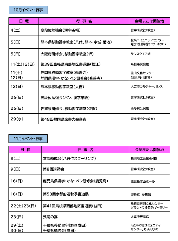 令和7年度 10月・11月行事開催日程