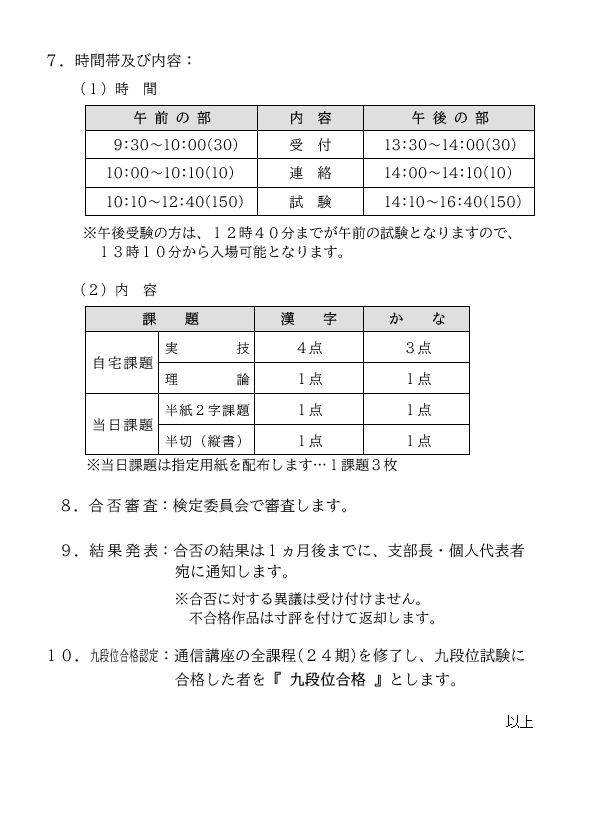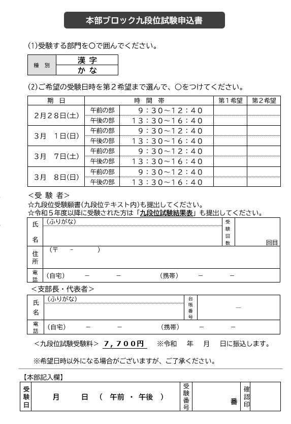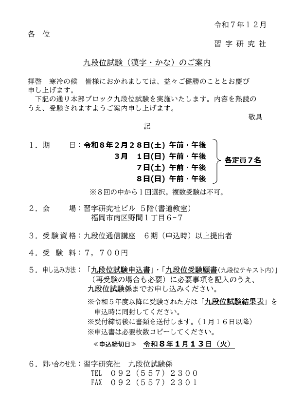 令和8年2月28日(土)3月1日(日)7日(土)8日(日)に開催予定の本部ブロック九段位試験についてご案内いたします。(1月号定期発送同封)