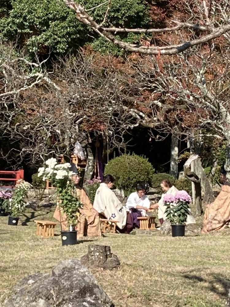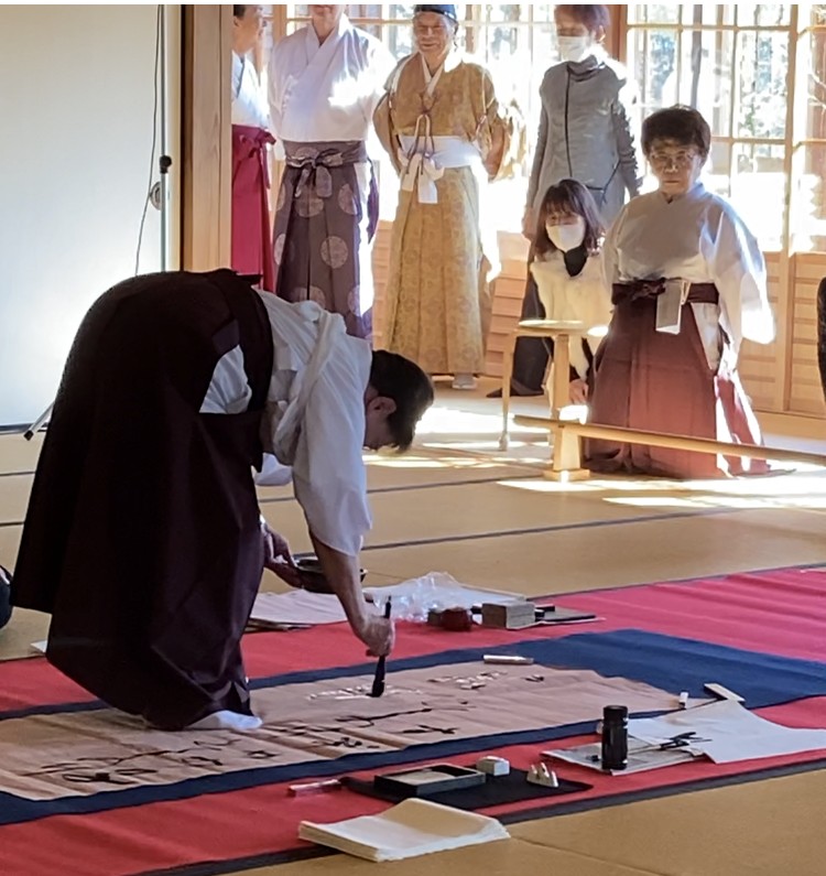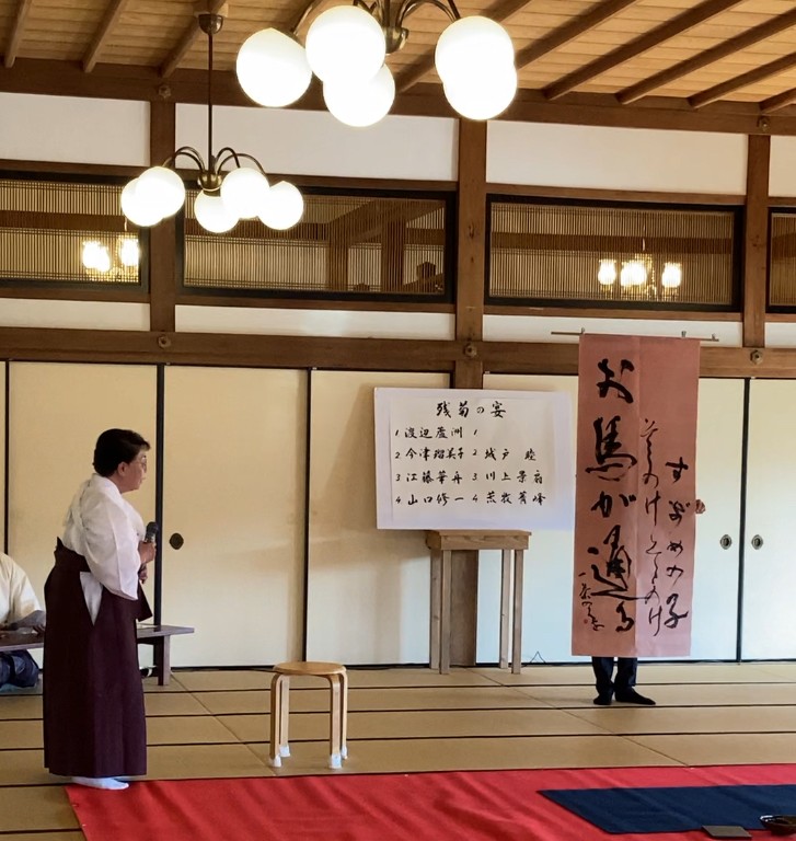 秋晴れの紅葉の中、曲水の庭で悠久の舞、菊酒を頂く盃の儀の後、文書館大広間で「墨書の儀」が行われました。